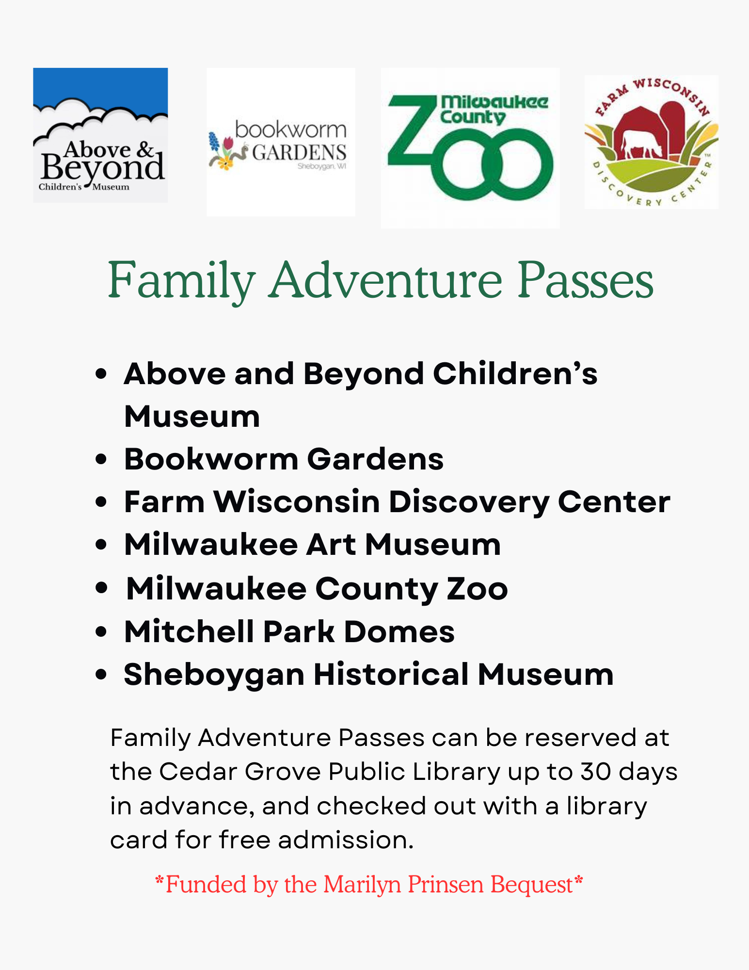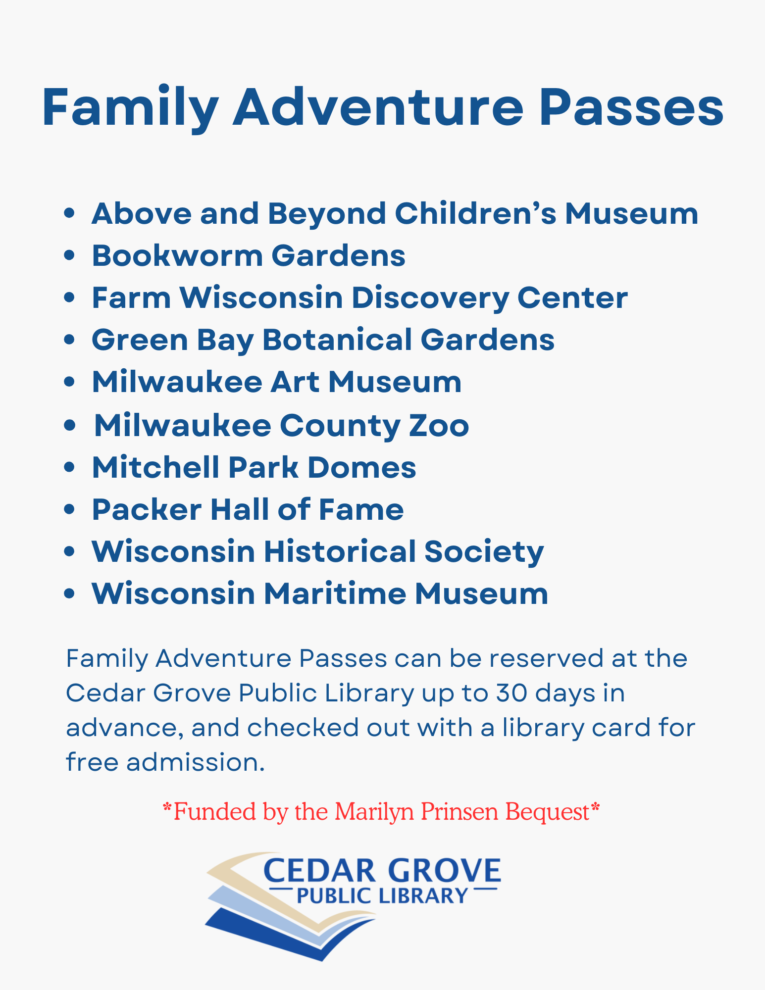 Thanks to a generous donation from the Marilyn Prinsen bequest, the Cedar Grove Public Library has been able to purchase passes to attractions in surrounding communities. Passes can be reserved up to 30 days in advance with an Adult Library card and can be checked out for a 3 day period. Click on the Family Adventure Pass Link for more information.